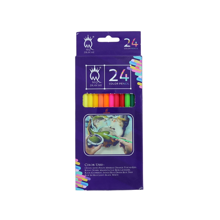 مداد رنگی ۲۴ رنگ MQ با رنگ‌های شفاف، نوک نرم و بسته‌بندی باکیفیت، انتخابی مناسب برای دانش‌آموزان، هنرجویان و طراحان خلاق.