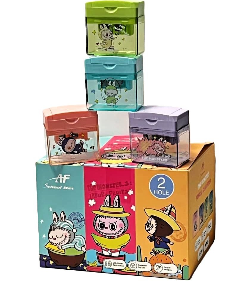 تراش اسکول مکس طرح لبوبو دوقلو با تیغه‌های فولادی تیز، طراحی فانتزی و کیفیت بالا، مناسب برای تراش دقیق مدادها و استفاده طولانی‌مدت.